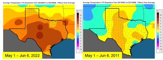 The maps above tell an important story. On the left, we see early summer in 2022, where much of Texas is shaded in dark orange and red — colors that indicate temperatures far above the long-term average. In fact, by early June, Texas was already running 5–10°F hotter than normal across a large portion of the state. On the right, the same period in 2011 looks far less alarming, with much of the state closer to average or even slightly cooler. And yet, 2011 went on to become one of the most extreme heat waves in Texas history.